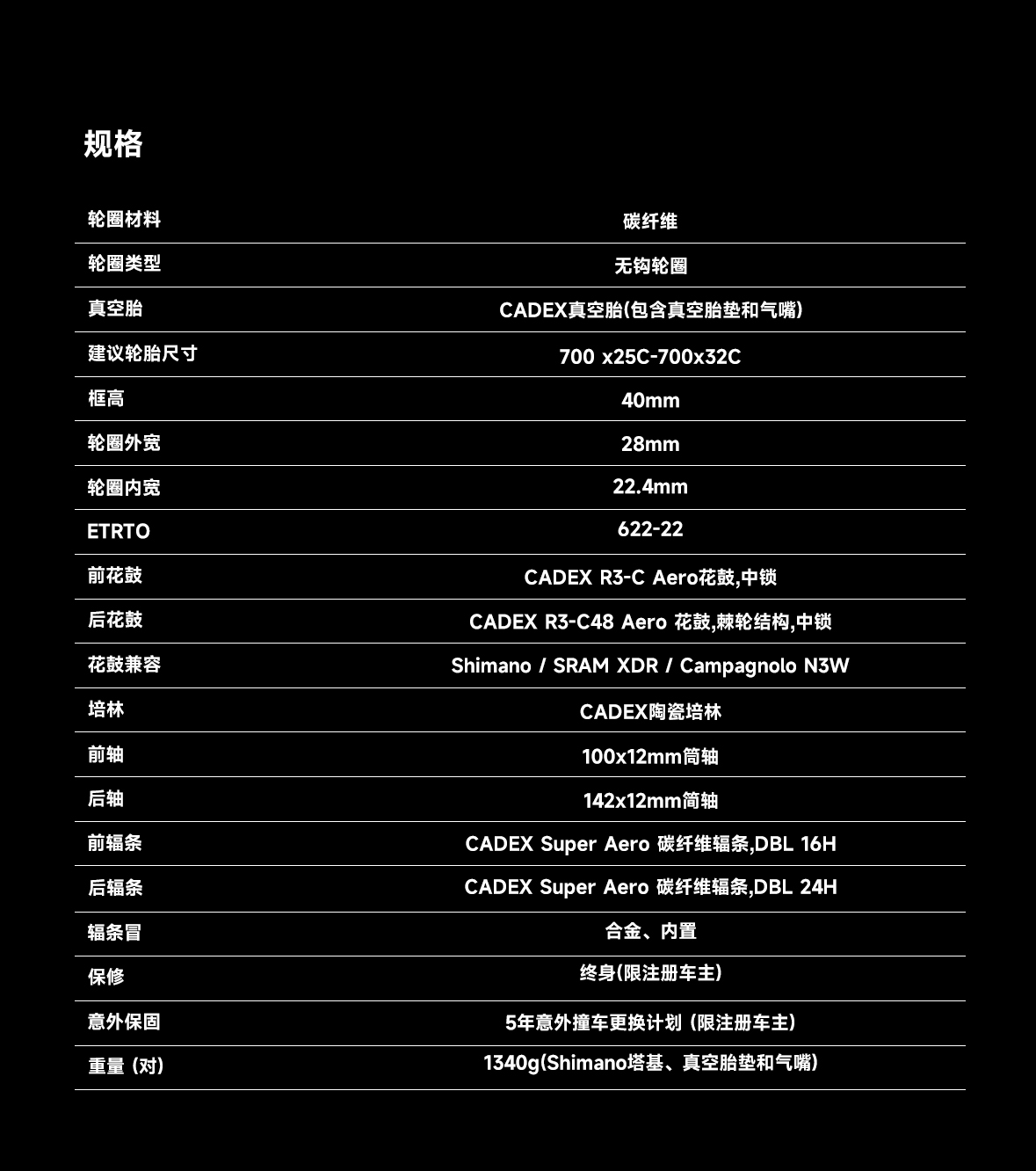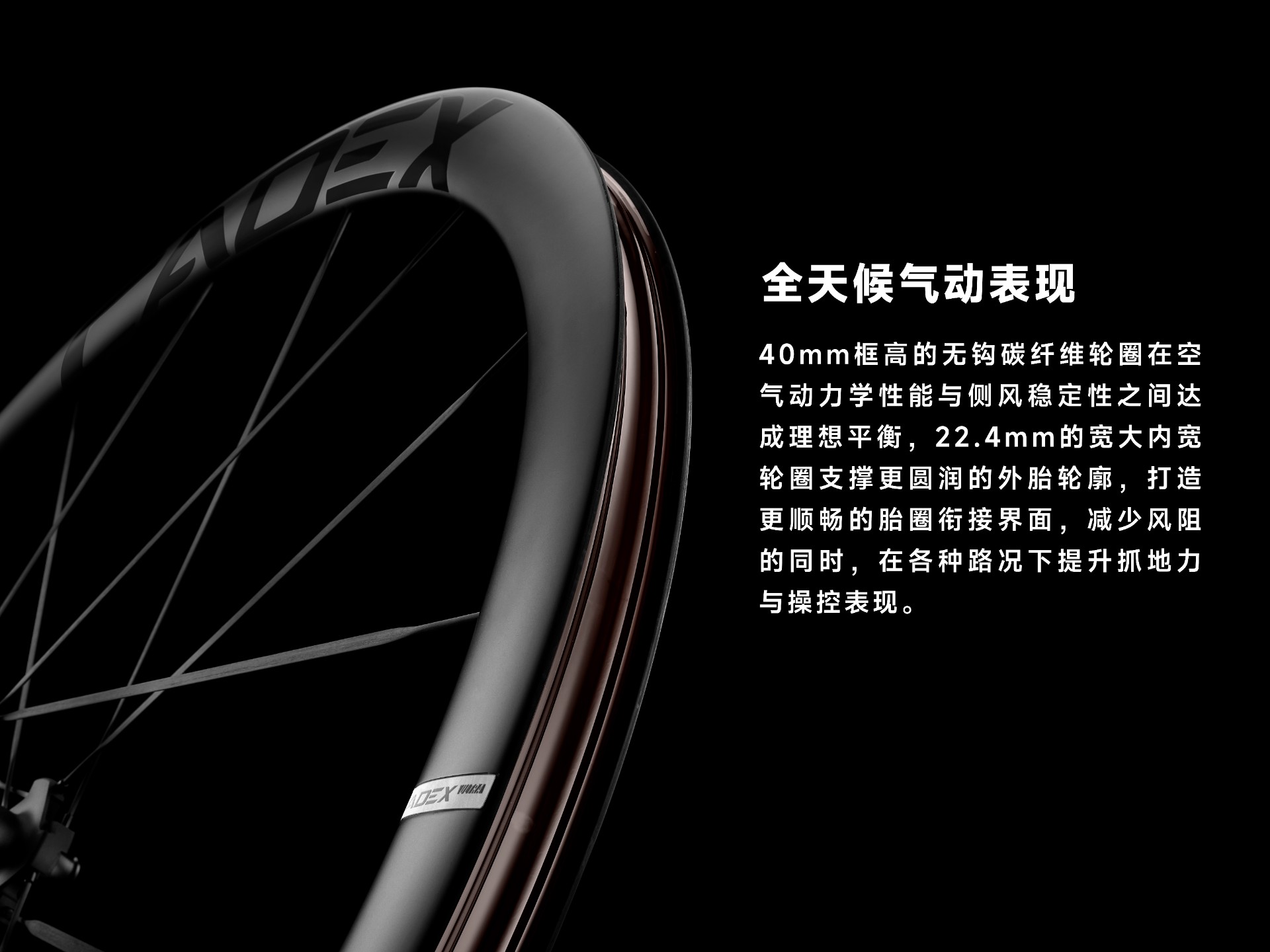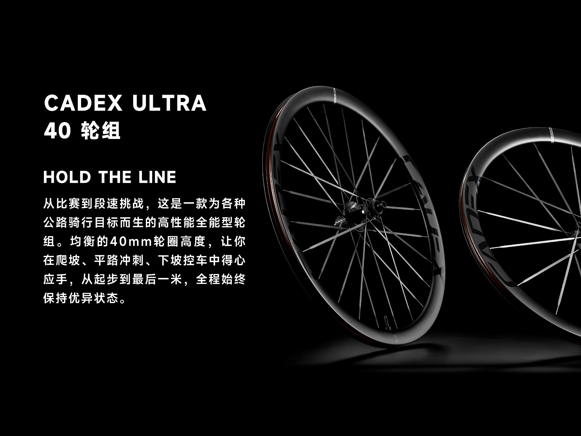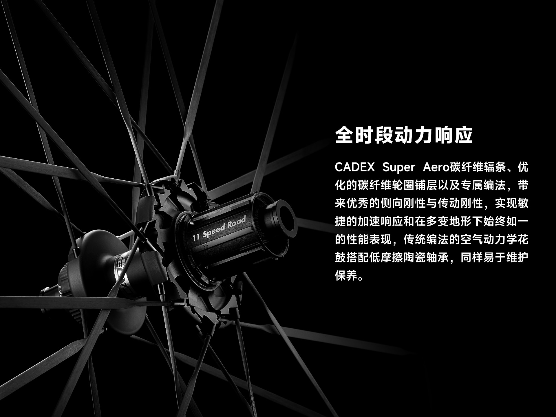 超轻量的高张力CADEX空力碳纤辐条提供同级最佳的侧向刚性与空力效果,即使面对侧风依然提供出色的操控稳定性。